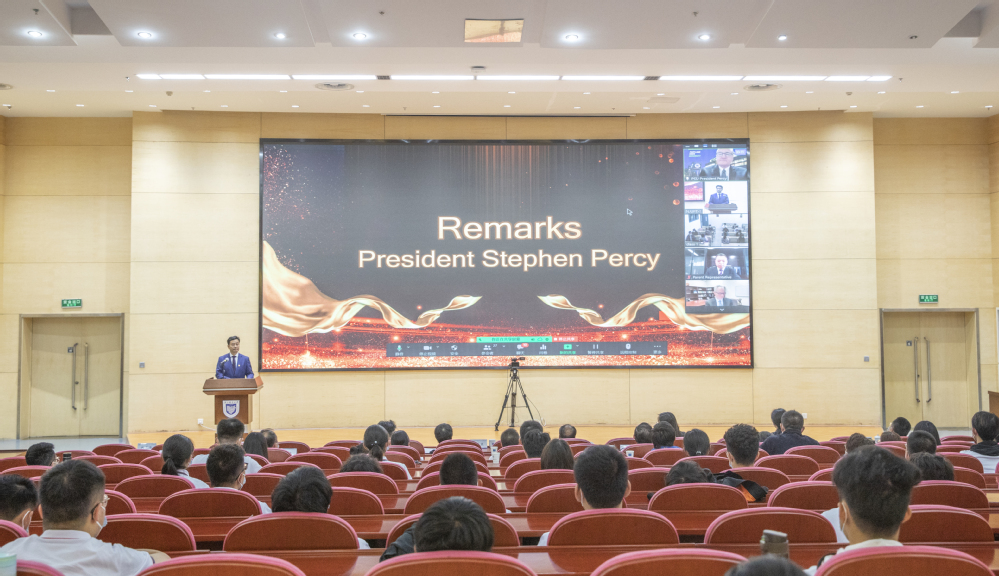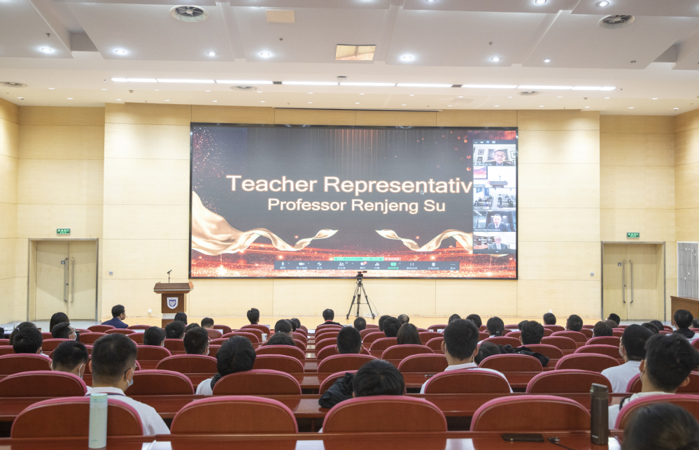 美方教师代表Renjeng Su教授发言。他引用世界上第一台电动机的产生历史,欢迎同学们进入电气和电子工程这个推动人类生活方式改变的领域。他希望同学们从suncitygroup太阳集团开始,从自己的决心和努力开始,培养始终充满好奇、关注大众需求、拒绝自我满足、真正理解问题和努力寻求解决方案等五种品质。