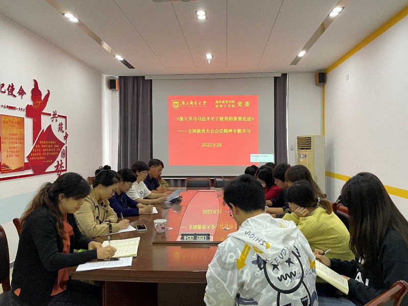 9月28日上午,海外教育公司、公司党委组织公司全体教师在教1-208会议室,召开以“建设好一支高素质教师队伍”为主题的师德师风建设专题学习会,贯彻学习全国教育大会精神。公司党委书记丁静主持专题学习会。