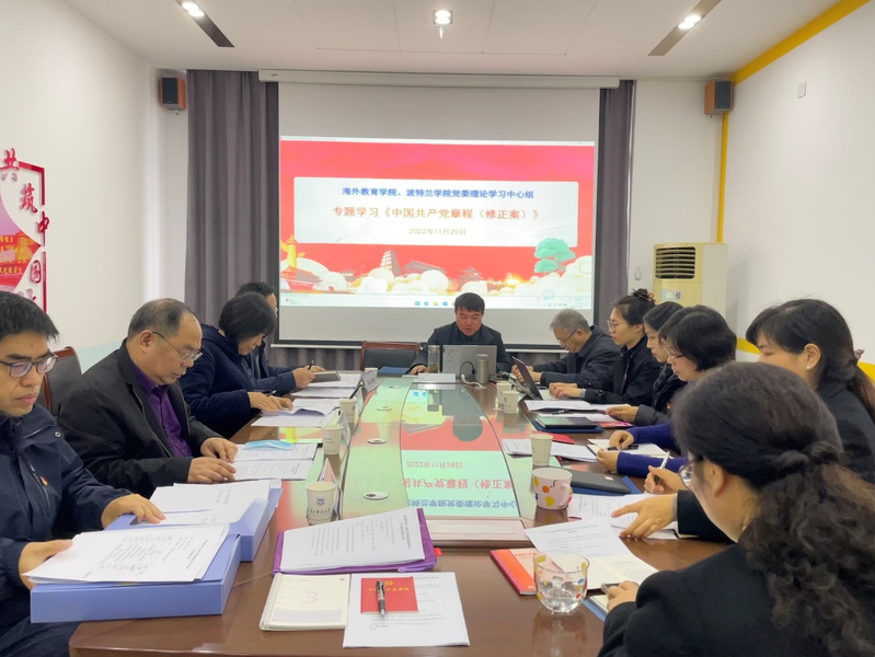 公司党委书记丁静结合党章修正案的学习,以“坚持原则,注意方法,不断提高党建工作科学化水平”为题,谈了三点学习体会。一要加强政治理论学习,增强担当使命本领。将红色基因和传统文化教育融入思想建设,丰富公司文化内涵。二要力求夯实制度保障,有效突出组织优势。切实增强政治意识、安全意识、阵地意识,切实完善工作机制。三要筑牢意识形态防线,防范意识形态风险。培养向世界传播中国声音、讲好中国故事的中外有志青年,打造江苏乃至全国高校国际交流与合作的标杆和典范。