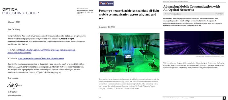 该研究成果发表在国际学术期刊《Optics Express》上,并被编辑亮点推荐。论文发表18天后,Optica出版集团专门发来贺信,称全球范围内“潜在读者超过1.28亿”,被国际科技媒体“Tech Xplore”、新闻资讯网站“AZO Optics”等广泛报导。