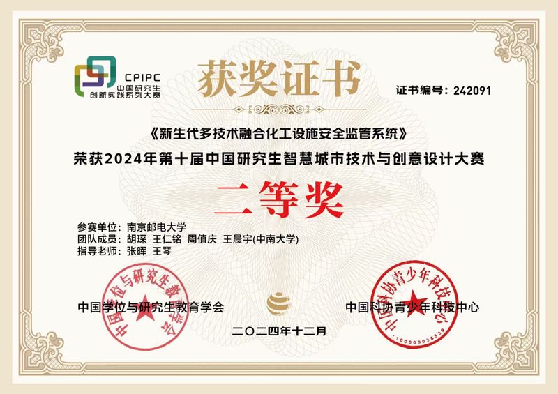 第十届中国研究生智慧城市技术与创意设计大赛决赛于2024年12月13日在重庆大学隆重举行,经线上初赛排名、线下决赛专家委员会评审组会评,公司胡琛、王仁铭、周值庆三位硕士研究生在张晖老师的指导下,组成的“智驭未来”队以作品《新生代多技术融合化工设施安全监管系统》参加大赛,并最终取得大赛二等奖。