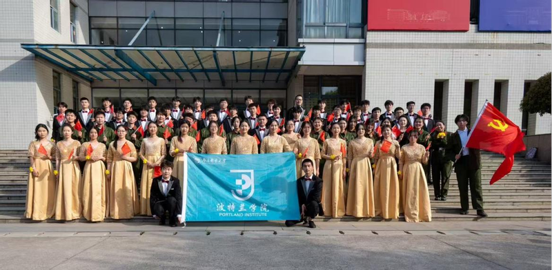 舞台上,“波小柚”以昂扬姿态亮相,通过双声部合唱的磅礴交织、情景手舞的铿锵律动,将经典红歌演绎出时代新意。同学们以手部动作模拟“开拓前行”的奋进姿态,配合背景视频,生动诠释了“革命气势不可阻挡”的歌曲内核。