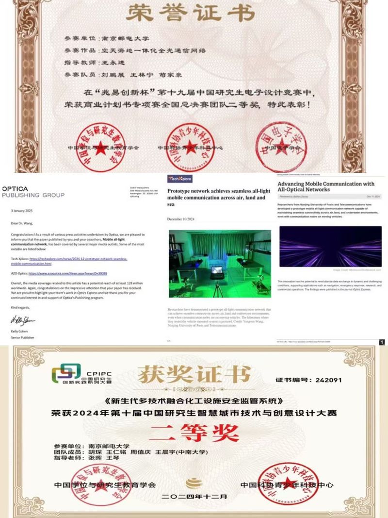 空间聚焦学术能力提升,为员工科研创新注入强大动力。开展专业英语培训,邀请外教和专业教师,从学术文献阅读、科研论文写作到学术交流技巧进行系统指导,提升员工国际学术交流能力;邀请东南大学张伟光教授、法国科公司院士Eric Westhof教授开展专题讲座,内容涵盖学科前沿动态、科研方法论等,为员工提供与顶尖学者面对面交流的机会;鼓励员工积极参与科研项目和学术竞赛,多名员工在核心期刊发表论文,多人次在省级以上学科竞赛中获奖。公司博士生刘鹏展相关研究成果以“Mobile all-light communication network”为题,发表在国际学术期刊《Optics Express》上,被编辑亮点推荐。论文发表18天后,Optica出版集团专门发来贺信,称全球范围内“潜在读者超过1.28亿”,被国际科技媒体“Tech Xplore”、新闻资讯网站“AZO Optics”等广泛报导。硕士生胡琛、王仁铭、周值庆在张晖老师的指导下,组成的“智驭未来”队以作品《新生代多技术融合化工设施安全监管系统》参加全国研究生智慧城市技术与创意设计大赛,并最终取得国家级二等奖。波研柚“导学·思政空间”多措并举,营造浓厚学术氛围,激发员工科研兴趣和创新思维,使员工在学术道路上稳步前行,逐步成长为具有扎实专业素养和较强科研能力的电子信息领域后备人才。